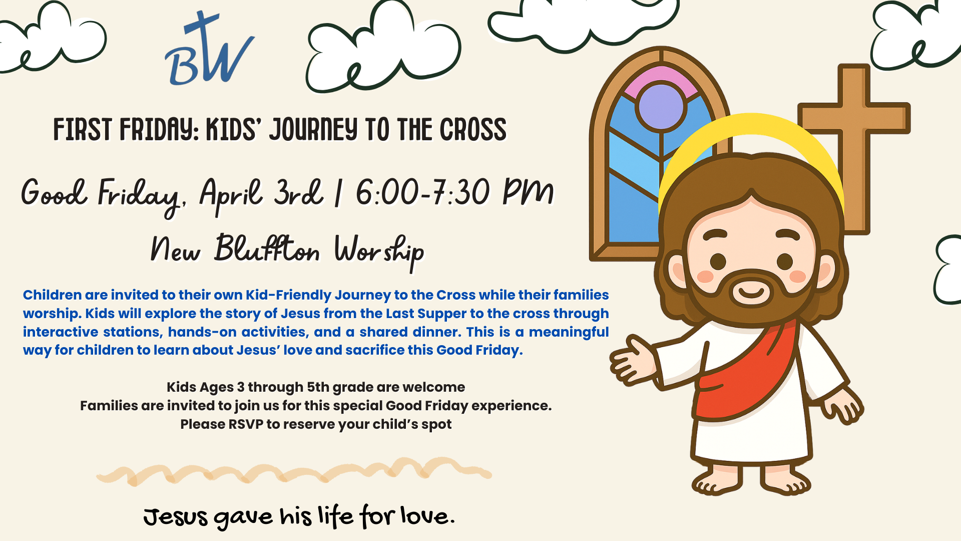 Children are invited to experience their own Kid-Friendly Journey to the Cross while their families worship. Kids will explore the story of Jesus from the Last Supper to the cross through interactive stations, hands-on activities, and a shared dinner. This is a meaningful time for children to connect with Jesus, learn about His love and sacrifice, and understand the real reason for Easter.